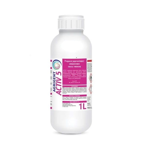 Większość substancji jest bardziej efektywnych w środowisku kwaśnym. ACTIV 5 zakwasza wodę oraz homogenizuje mieszanki zbiornikowe (zwłaszcza produktów w formie proszku). Zapobiega także zatykaniu dysz oraz poprawia kąt rozpylania.