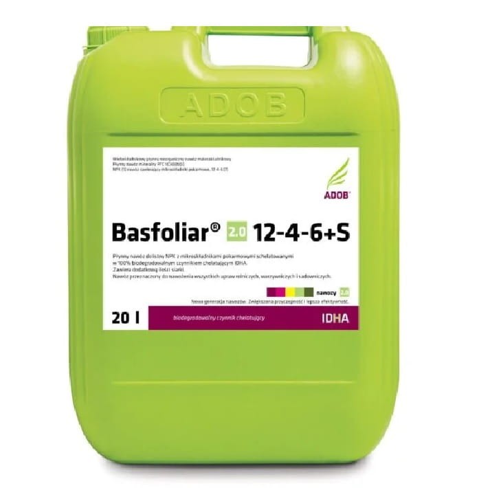 Basfoliar 2.0 12-4-6+S to kompleksowy, wieloskładnikowy, płynny nawóz dolistny zawierający wszystkie niezbędne dla roślin makroelementy: azot (N), fosfor (P), potas (K), oraz mikroelementy: bor (B), cynk (Zn), miedź (Cu), mangan (Mn), molibden (Mo), żelazo (Fe), wzbogacony o dodatek siarki (S) i magnezu (Mg). Mikroelementy w nawozie (poza borem i molibdenem) są schelatowane nowoczesnym, biodegradowalnym czynnikiem chelatującym IDHA, dzięki czemu są łatwo i szybko dostępne dla roślin. Innowacyjna technologia 2.0 poprawia przyswajalność składników pokarmowych przez rośliny i zwiększa efektywność działania nawozu.