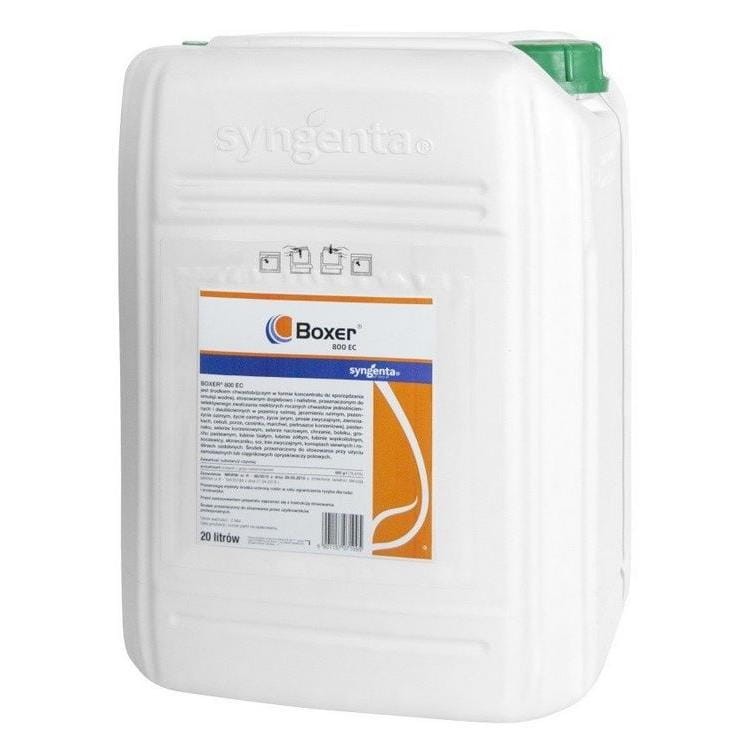 Sposób działania: Boxer 800 EC jest środkiem chwastobójczym w formie koncentratu do sporządzania emulsji wodnej, stosowanym doglebowo i nalistnie, przeznaczonym do selektywnego zwalczania niektórych rocznych chwastów jednoliściennych i dwuliściennych w pszenicy ozimej, jęczmieniu ozimym, pszenżycie ozimym, życie ozimym, życie jarym, prosie zwyczajnym, ziemniakach, cebuli, porze, czosnku, marchwi, pietruszce korzeniowej, pasternaku, selerze korzeniowym, selerze naciowym, chrzanie, bobiku, grochu pastewnym, łubinie białym, łubinie żółtym, łubinie wąskolistnym, soczewicy, słoneczniku, soi, lnie zwyczajnym, konopiach siewnych i roślinach ozdobnych. Środek przeznaczony do stosowania przy użyciu samobieżnych lub ciągnikowych opryskiwaczy polowych