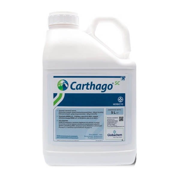 Carthago SC to profesjonalny seletywny herbicyd przeznaczony do zwalczania chwastów w uprawach zbóż ozimych. Preparat działa zarówno doglebowo, jak i nalistnie, dzięki połączeniu dwóch aktywnych substancji: diflufenikanu i flufenacetu. Gwarantuje długotrwałe działanie ochronne, szczególnie skuteczne przy wilgotnej glebie oraz w fazie kiełkowania lub bezpośrednio po wschodach chwastów.