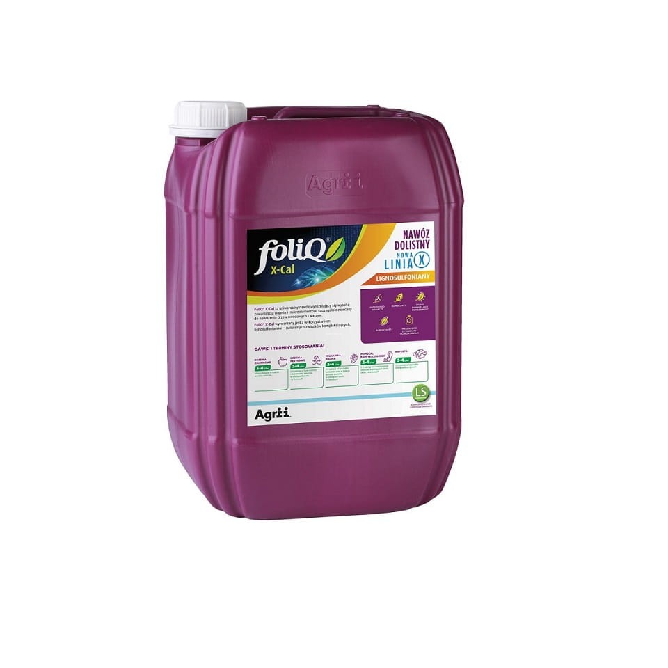 FoliQ X-Cal to precyzyjny nawóz do dolistnego i doowocowego dokarmiania wapniem i mikroelementami. Idealnie nadaje się do dokarmiania owoców, warzyw i innych upraw w celu optymalnego zaopatrzenia w wapń. Nawóz poprawia jędrność owoców i ich zdolności przechowalnicze, ogranicza występowanie chorób fizjologicznych powodowanych niedoborem wapnia oraz redukuje występowanie stresów biotycznych i abiotycznych, nie powodując zbędnej stymulacji wzrostu wegetatywnego. FoliQ X-Cal formułowany jest z wykorzystaniem lignosulfonianów, naturalnych związków kompleksujących, co zwiększa przyczepność nawozu do liści oraz zapewnia długotrwałe i efektywne pobieranie składników odżywczych przez rośliny. Nawóz wykazuje więc właściwości charakterystyczne dla kondycjonerów wody.