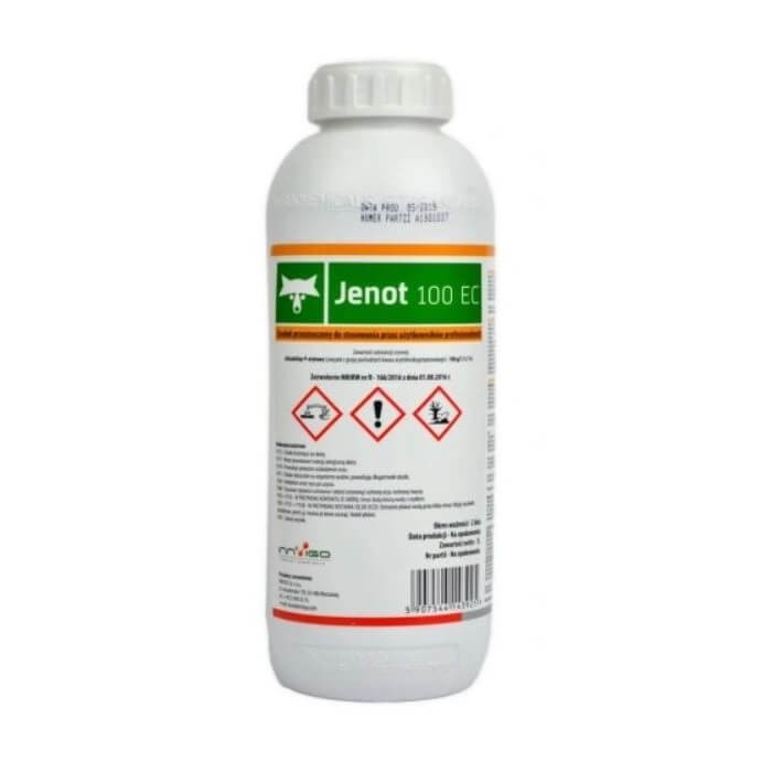 Stosowanie: Jenot 100 EC jest herbicydem selektywnym o działaniu układowym. Pobierany jest bardzo szybko przez liście, a następnie przemieszczany do korzeni i rozłogów chwastów, powodując zahamowanie ich wzrostu i rozwoju. Działanie środka na chwasty objawia się żółknięciem, a następnie zasychaniem najmłodszych liści i widoczne jest po upływie około 7 dni od opryskiwania. Pełny efekt jest widoczny po około 2-3 tygodniach, w zależności od przebiegu pogody. Chwasty roczne są najbardziej wrażliwe na działanie środka od fazy 2 liści do początku krzewienia, perz właściwy w fazie 4-6 liści.