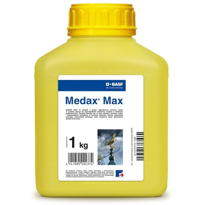 Sposób działania: MEDAX MAX to środek z grupy regulatorów wzrostu roślin w postaci granul do sporządzenia zawiesiny wodnej o działaniu systemicznym. Środek stosuje się w celu redukcji wzrostu roślin i zapobiegania wyleganiu w uprawie pszenicy ozimej, pszenżyta ozimego, jęczmienia ozimego, żyta, pszenicy jarej, jęczmienia jarego oraz owsa. Środek przeznaczony do stosowania przy użyciu samobieżnych lub ciągnikowych opryskiwaczy polowych