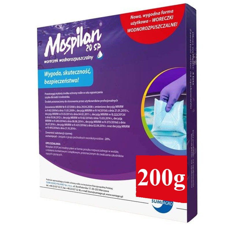 Sposób działania: Mospilan 20 SP jest środkiem owadobójczym w formie proszku rozpuszczalnego w wodzie, o działaniu kontaktowym i żołądkowym, przeznaczony do zwalczania szkodników ssących i gryzących. Na roślinie działa powierzchniowo, wgłębnie i systemicznie. Środek Mospilan 20 SP stosowany jest przy użyciu opryskiwaczy ręcznych