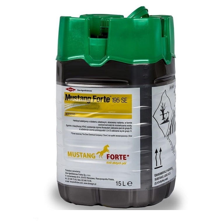 Dostępny na tej podstronie w naszym sklepie internetowym wysokiej klasy herbicyd do zbóż MUSTANG FORTE 195 SE to doskonały produkt chwastobójczy. Jego skuteczność została potwierdzona wieloma pozytywnymi opiniami zadowolonych klientów. Oprysk MUSTANG FORTE zawiera trzy składniki aktywne: florasulam w stężeniu 5 gram na jeden litr, aminopyralid w stężeniu 10 gram na litr oraz 2,4 D w stężeniu 180 gram na litr. Takie połączenie daje bardzo dobre efekty w walce z różnego rodzaju chwastami, które mogą pojawić się w miejscach, gdzie uprawia się jęczmień jary czy owies. Ogromną zaletą tego preparatu jest również jego atrakcyjna cena. Serdecznie zapraszamy wszystkich zainteresowanych do zakupu. Gwarantujemy szybką realizację zamówienia.