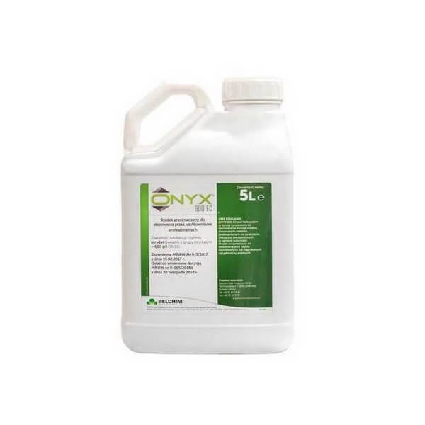 Stosowanie: ONYX 600 EC jest selektywnym herbicydem, o działaniu kontaktowym. Pobierany jest przez liście chwastów i w niewielkim stopniu przemieszczany w tkankach rośliny. Środek najskuteczniej działa na chwasty będące w fazie od 2. do 6 liści (BBCH 12-16), w warunkach wilgotnej i ciepłej pogody